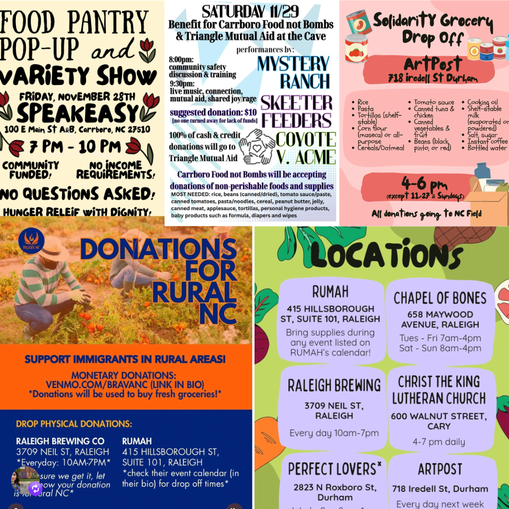 In this moment, on top of the always-existing food insecurity in our region, new waves of need have been purposefully created by the arbitrary disruption in government food assistance programs and by sudden spikes in racialized immigration “enforcement”. Triangle Mutual Aid has mobilized in similar fashion to our work in natural disaster response, working with volunteers and partner businesses to set up food and supply drop-off points, transported by volunteers to sorting and distribution locations.